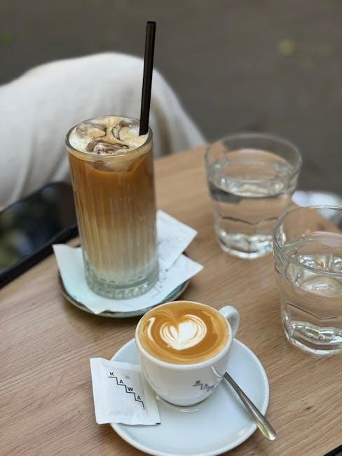 Classic espresso-based beverages form the foundation of coffee culture, offering timeless appeal. The Italian Espresso is a quintessential short drink, made by forcing pressurized hot water through finely ground beans. Caffè Macchiato adds a dollop of foam, while Espresso Con Panna tops it with whipped cream. Caffè Latte blends espresso with steamed milk, creating a creamy texture. Cappuccino combines espresso, steamed milk, and foam in perfect harmony. These traditional recipes, detailed in PDF guides, provide a starting point for enthusiasts to master the art of espresso, ensuring each sip delivers authentic flavor and rich aroma, just like in Italian cafes.
